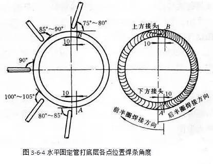 各點位置焊條角度如圖3-6-4及3-6-5所示。前半圈與后半圈相對應的焊接位置,焊條角度相同。