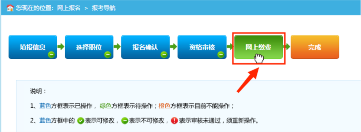 1.通過資格審查的報考者,點擊報考導(dǎo)航頁面“網(wǎng)上繳費”按鈕進(jìn)入繳費頁面。