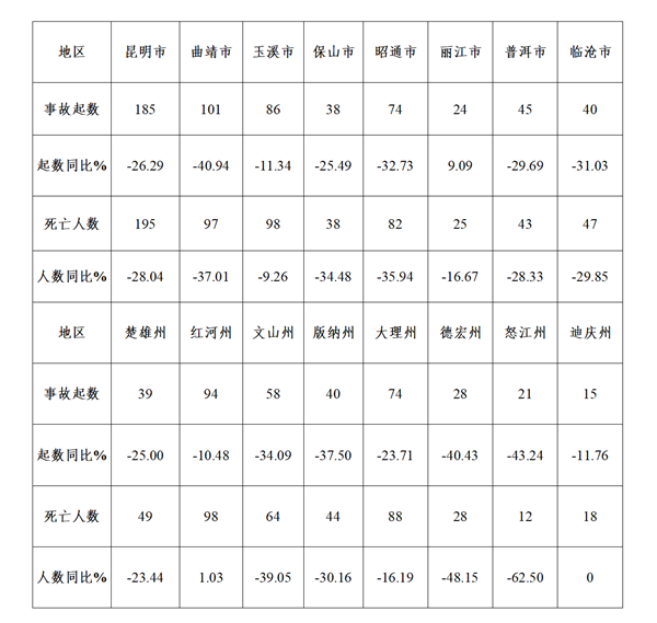 1-11月份,9個州市發(fā)生較大事故:大理州4起、死亡13人,同比增加2起、6人;曲靖市3起、死亡14人,同比增加1起、7人;楚雄州2起、死亡7人,同比起數持平、死亡人數減少1人;紅河州2起、死亡7人,同比增加1起、2人;文山州2起、死亡6人,同比減少3起、11人;玉溪市1起、死亡6人,同比起數持平、死亡人數增加1人;昭通市1起、死亡4人,同比減少3起、8人;臨滄市1起、死亡6人,同比起數持平、死亡人數增加2人;迪慶州1起、死亡4人,同比增加1起、4人。各州市事故總體情況詳見下表: