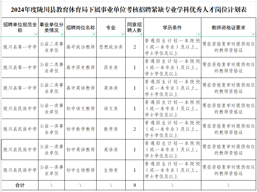 根據(jù)《關于同意縣教育體育局黨組使用編制通知單》(隴機編辦準[2023]4號)及《隴川縣人力資源和社會保障局關于印發(fā)2024年教育衛(wèi)生部門考核招聘緊缺專業(yè)學科優(yōu)秀人才工作方案的通知》隴人社發(fā)〔2024〕2號文件精神,2024年隴川縣教體系統(tǒng)考核招聘緊缺專業(yè)學科優(yōu)秀人才9名,其中:隴川縣第一中學4名、隴川縣民族中學5名,F(xiàn)將有關事宜公告如下: