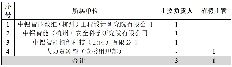 詳見《中鋁智能科技發(fā)展有限公司面向社會公開招聘崗位一覽表》(附件1)。