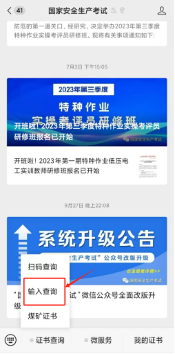 方式二:微信搜索并關注官方微信公眾號“國家安全生產考試”,點擊證書查詢→輸入查詢,查詢證書信息及復審時間。