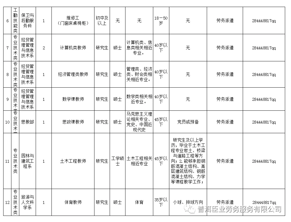 (五)報考專職教師崗位要求全日制研究生學歷及碩士以上學位(具體要求詳見附表);報考管理崗位要求全日制本科學歷及學士以上學位(部分崗位限專業(yè),具體要求詳見附表)。報專業(yè)技術崗位思教部者,黨員或預備黨員優(yōu)先。