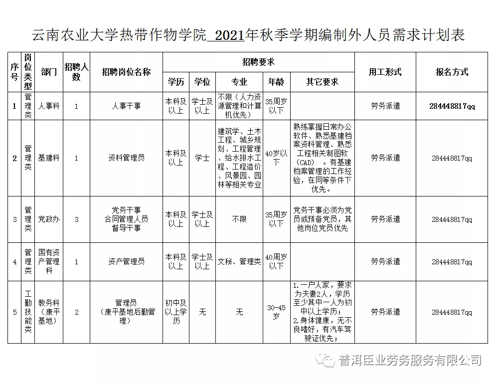 工作人員18名,均為云南農業(yè)大學熱帶作物學院非事業(yè)編制人員(即編制外合同制人員),具體崗位信息詳見附件。