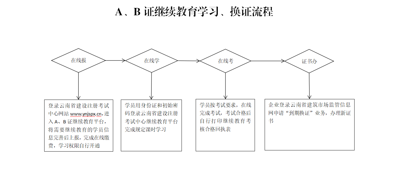 云南省建設(shè)廳安全員A、B證繼續(xù)教育學(xué)習(xí)、換證流程圖