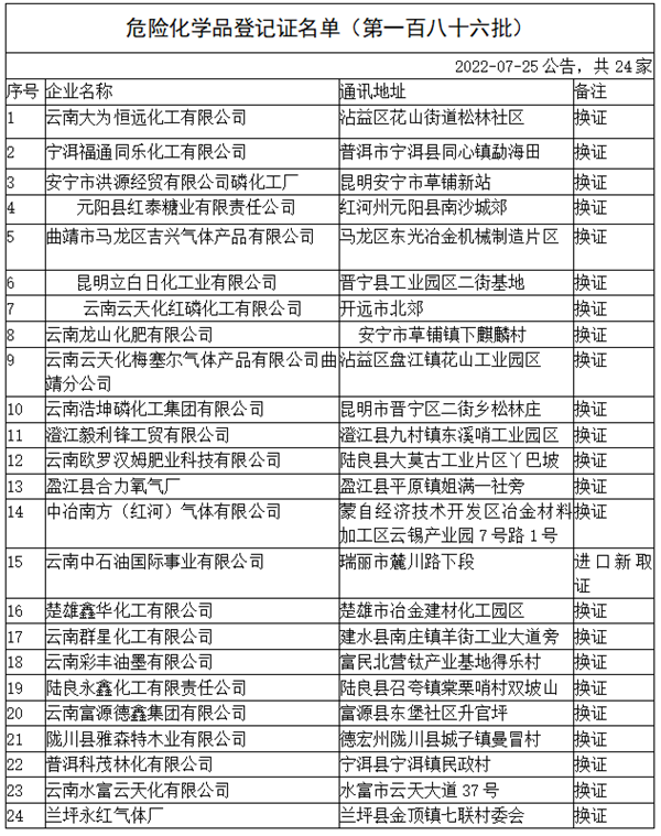 根據(jù)《危險化學(xué)品安全管理條例》《危險化學(xué)品登記管理辦法》有關(guān)規(guī)定,經(jīng)云南省危險化學(xué)品登記中心初審、應(yīng)急管理部化學(xué)品登記中心審核合格,下列危險化學(xué)品生產(chǎn)、進口單位(共24家)取得《危險化學(xué)品登記證》,現(xiàn)予以公告。